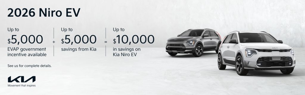 FOR ALL OFFERS: All prices and payments advertised include freight and PDI (up to $599); A/C charge ($100); regulatory fees (up to $22); lien registration fees (up to $168, including lien registering agent fee); as well as all other applicable fees, levies and duties (all of which may vary by region and dealer). License, insurance, registration and applicable sales taxes are extra. Dealer may lease or sell for less. Dealer order/trade may be necessary (but may not be available in all cases). Offer ends March 31, 2026, and is subject to change or cancellation without notice. REPRESENTATIVE FINANCE OFFER: Limited-time finance offers provided from March 3, 2026, to March 31, 2026, on approved credit. Representative finance example based on a new and previously unregistered 2026 Sportage LX AWD. Vehicle price is $35,358 (excluding paint price). 0.99% finance APR for 60 months includes 1% loyalty rate reduction for eligible customers. Weekly finance payment is $144. $0 down payment or equivalent trade-in required. Cost of borrowing is $1,794, for a total obligation of $37,402. Total of 260 weekly payments required during the term. * Up to $5,000 Electric Vehicle Affordability Program (EVAP) incentive available only to eligible Canadian residents who purchase, finance or lease (48 month term or more) a new and previously unregistered 2026 Kia Niro EV with a final transaction value not exceeding $50,000 (calculated in accordance with the EVAP program terms) from a participating Kia dealer in Canada between March 3, 2026 and March 31, 2026 (or until available funds are exhausted). EVAP incentive: (i) will be determined based on the date your participating dealer submits the eligibility form; (ii) will be deducted from the negotiated vehicle price after taxes; (iii) is limited to one (1) incentive per eligible person over the lifetime of the program; (iv) is provided on a first-come, first served basis until available funds are exhausted; and (v) cannot be applied to past transactions. The maximum EVAP incentive amount is scheduled to be reduced to $4,000 as of January 1, 2027, and to decline annually thereafter – until program termination currently set for March 31, 2031 (or until available funds are exhausted). The maximum incentive amount varies depending on the lease term; shorter lease terms may qualify for a lesser incentive amount. https://tc.canada.ca/en/road-transportation/innovative-technologies/zero-emission-vehicles/electric-vehicle-affordability-program-evap full program terms and conditions. EVAP government incentive is subject to availability, eligibility criteria and limits established by the Government of Canada and is subject to change or termination at any time. Kia Canada makes no representations about the actual amount of or eligibility for the EVAP incentive and is not responsible for the incentive (which is administered by the Government of Canada). Incentive information is provided for informational purposes only. Conditions and limitations apply. Visit kia.ca or your local Kia dealer for details.
